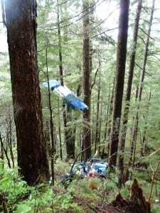 Troopers have also released photographs of the crash site, showing the wrecked Pacific Wings deHavilland Beaver hanging on a steep hillside about 1000 feet up a mountain on the mainland near LeConte Bay.