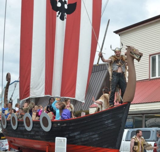 Carolyn Kvernvik and Aaron Phillips lead the Vikings in Petersburg’s Little Norway Festival Parade Friday