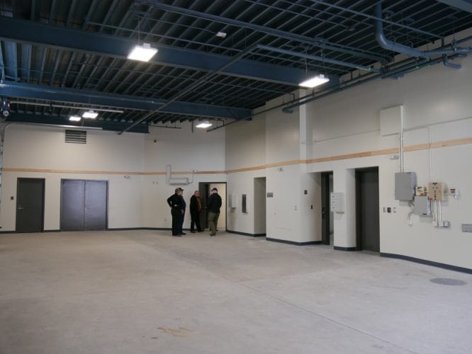 These days, the building houses the borough’s administration and finance offices along with an expanded police station. The first phase of work was completed earlier this year. A second phase is newly finished. That includes a vehicle sally port, where police officers can unload a prisoner out of the weather. It’s the space that used to house the old police station and now it’s a cavernous garage. Inside it, borough manager Steve Giesbrecht said the borough has signed off on substantial completion of the work, although some punch list items remain to be finished by the contractor.