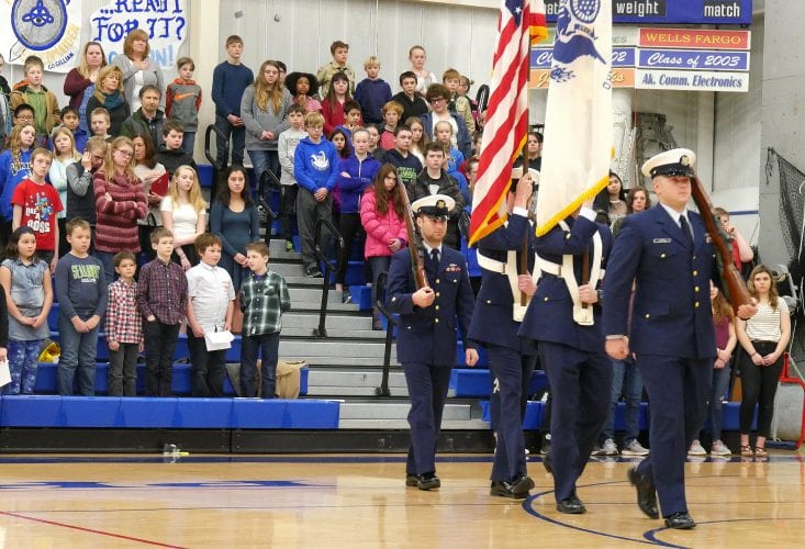 Students with Stedman Elementary School’s student council speak at the Veterans Assembly on, “What is a Veteran?” (Photo by Angela Dennig/KFSK)
