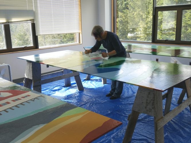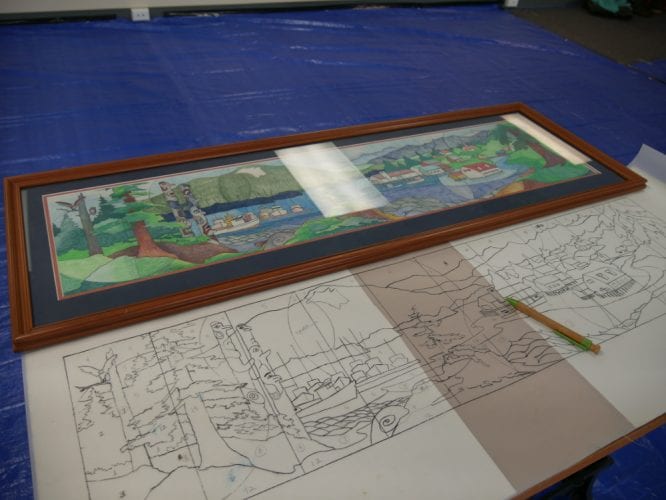 Last year the Petersburg Community Foundation awarded a $750 grant to the Petersburg Arts Council to refurbish the 10 painted, marine-grade plywood panels. Now another team of volunteers is finishing up re-painting the mural, this time in a second floor room at the Petersburg Indian Association’s Hallingstad-Peratrovich building.