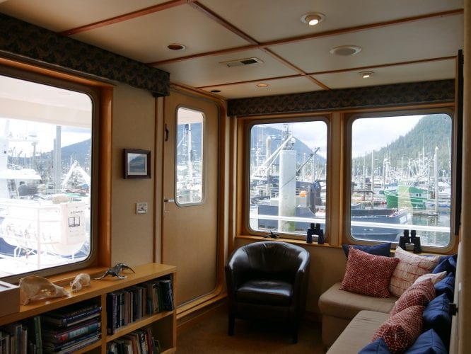 One level up from the main deck, a map of Pacific islands hangs above a low bookshelf. Big windows look out on the Wrangell Narrows, which the boat will travel through tomorrow. Beadle showed me the four luxury bedrooms, with sliding glass doors that open onto balconies over the water. There are seven more rooms on the floors below.