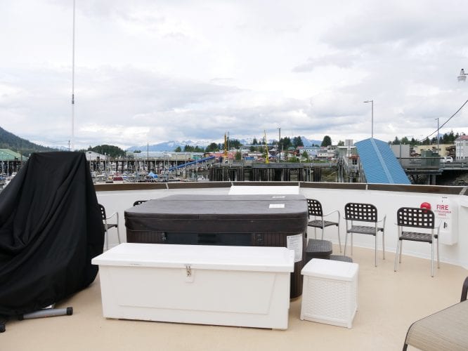We walked up to the top level of the boat, which held a rack of two person kayaks, a raft, and a hot tub. On the main deck, there were stand up paddle boards and several more places to watch whales and other wildlife. From Petersburg, the boat would head to the native community of Kake, three wilderness areas, and a national monument.