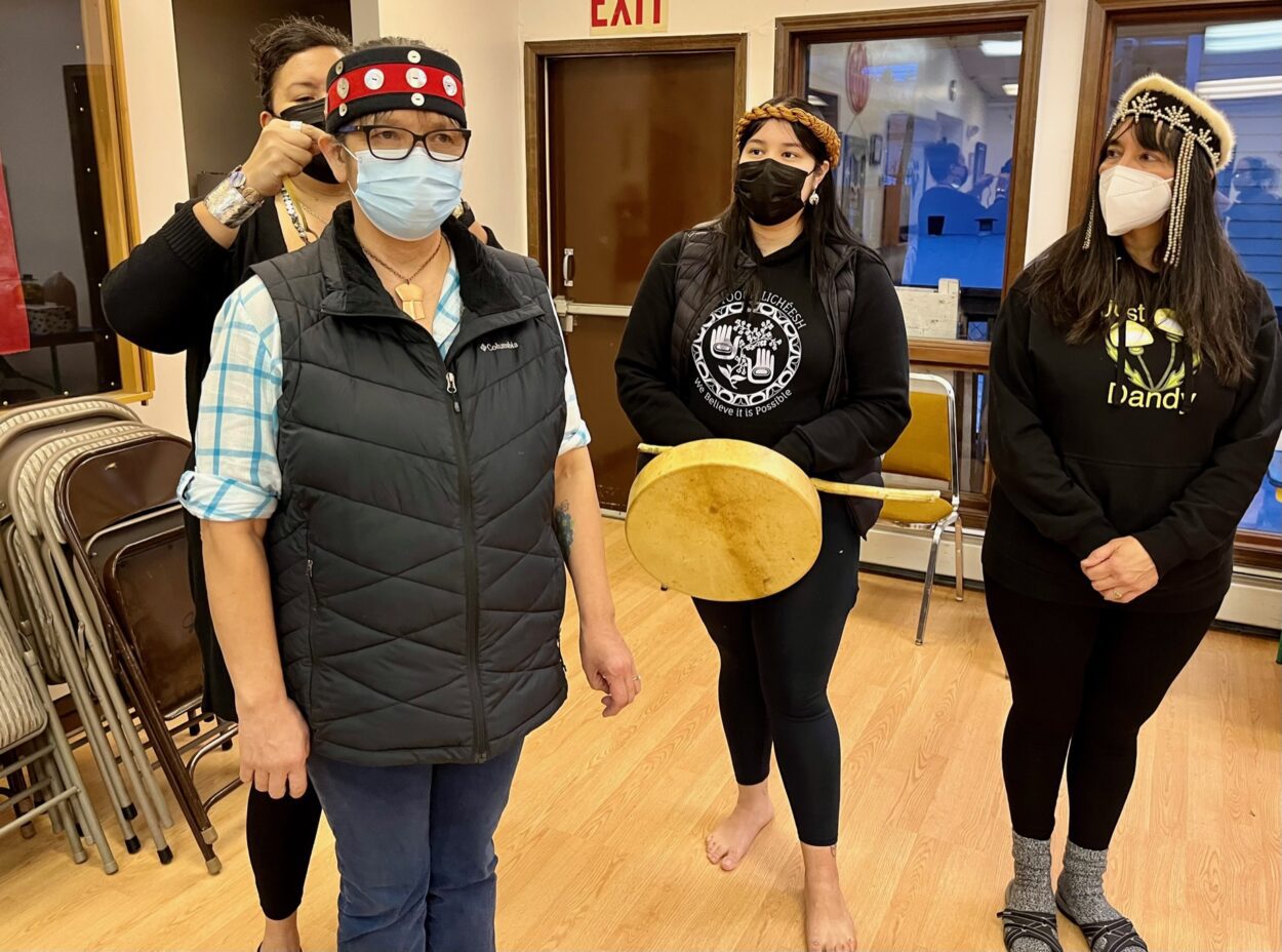 This regalia workshop is in its second day. When Corinne James finishes her headband, she presents it to Tina Sakamoto of Petersburg. It’s an emotional moment for her.
