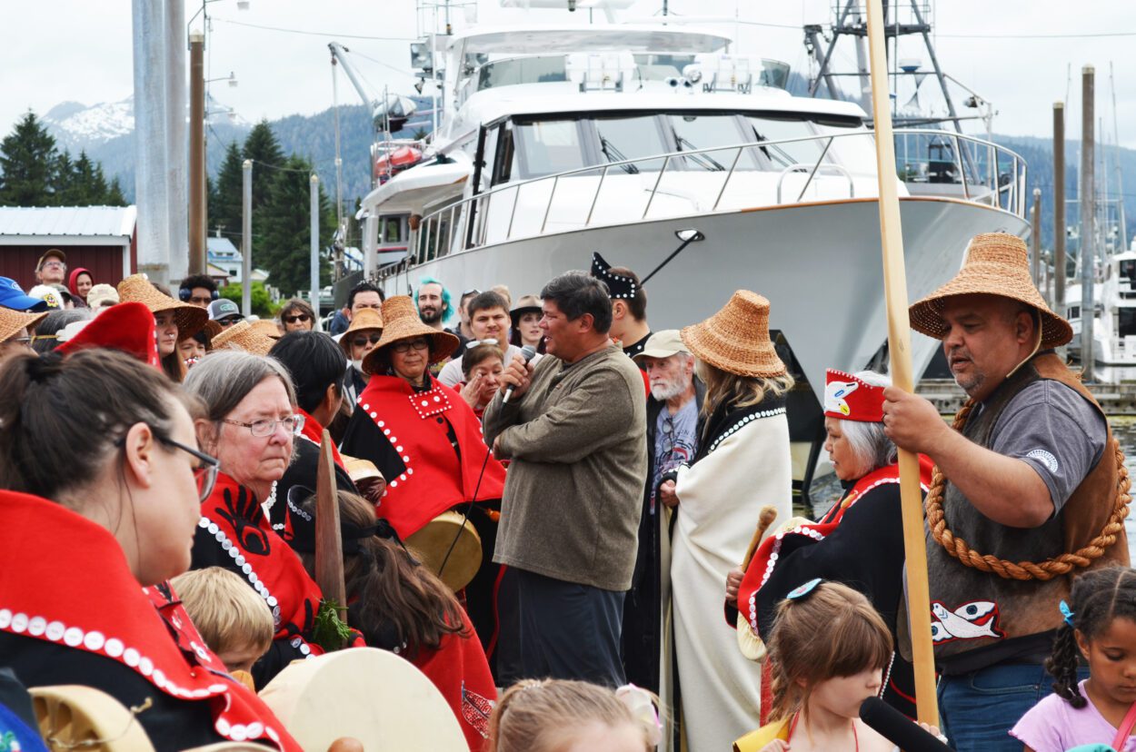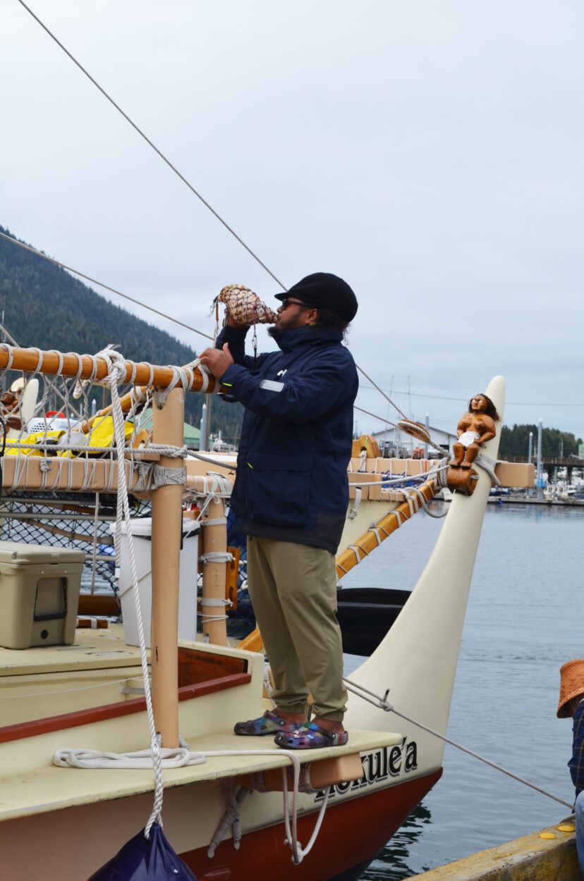 People lined North Nordic Drive on June 25th to welcome the Hōkūleʻa into the Wrangell Narrows. The crew reported that they could see people waving from houses all along North Nordic Drive. (Photo by Thomas Copeland/KFSK)The Hōkūleʻa as it entered Petersburg’s South Harbor on June 25th. (Photo courtesy of John Havrilik)Pu Kani, or the sounding of the conch, aboard the Hōkūleʻa. (Photo by Thomas Copeland/KFSK)Throngs of people line the docks and ramp of Petersburg’s South Harbor as the crew of the Hōkūleʻa tie up. (Photo courtesy of John Havrilik)Mark Ellis, Captain of the Hōkūleʻa for this leg of voyage, accepts the community’s welcome at Petersburg’s South Harbor. (Photo by Thomas Copeland/KFSK)