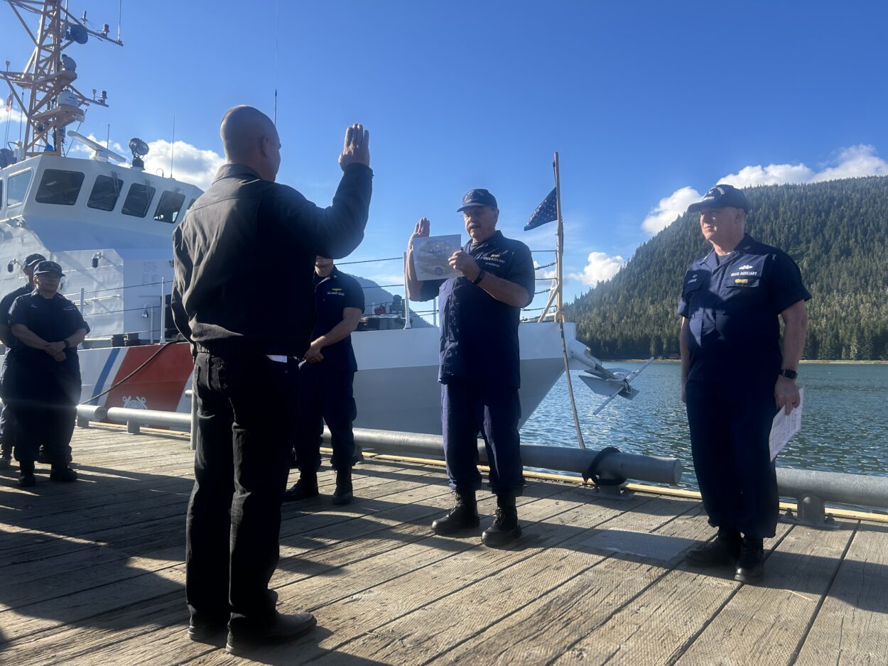 Coast Guard Auxiliary Commodore Marion Parrish was swearing in Petersburg resident Derek Lopez at the end of the town’s drive-down dock. Lopez is one of over a dozen residents who were honored for beginning their service to the town’s new Coast Guard Auxiliary group, which is called a flotilla.