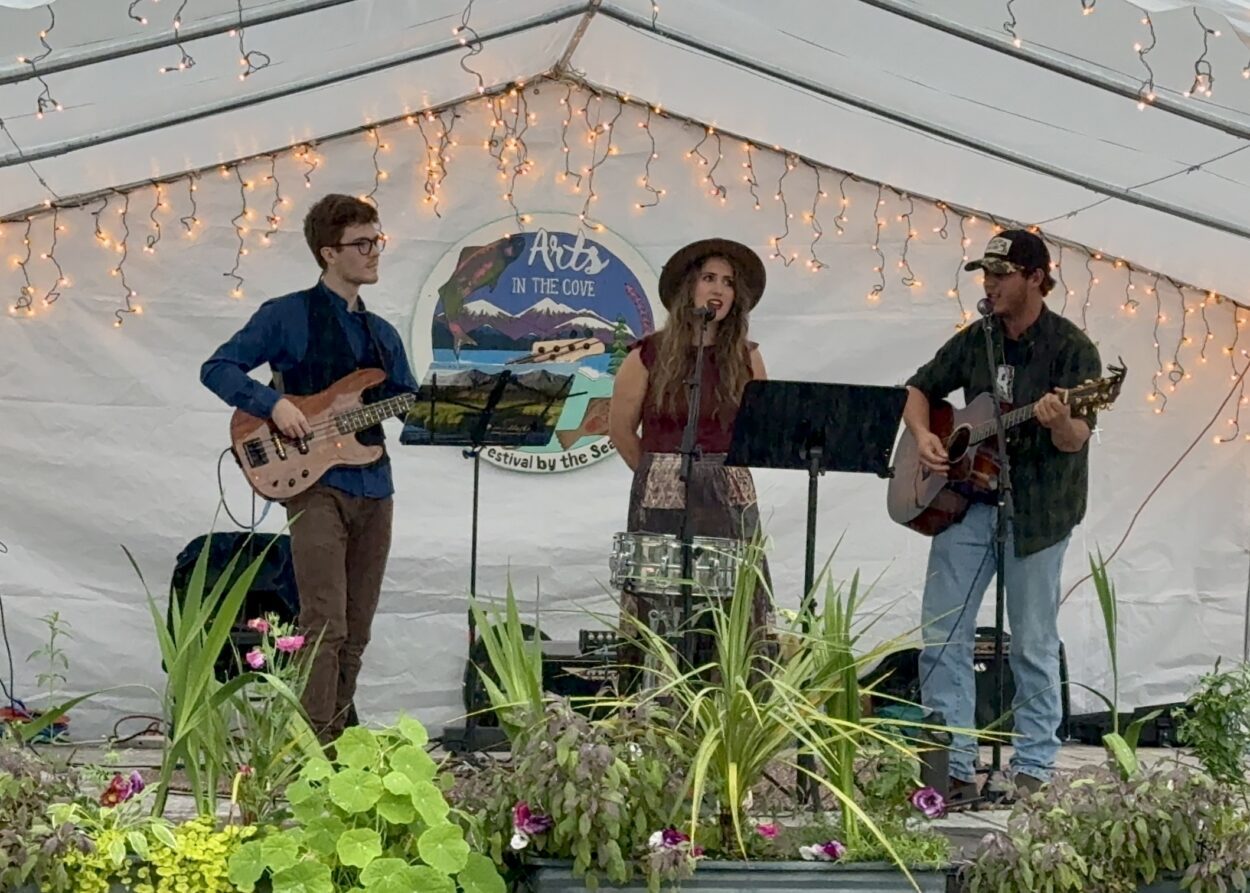They write music separately and perform the songs together, singing backup for each other. They also perform covers with lyrics re-written to be more applicable to Southeast Alaska. On the first night of the festival, they played a spin on John Denver’s “Take Me Home, Country Roads,” accompanied by their friend Matt Wintersteen on bass.