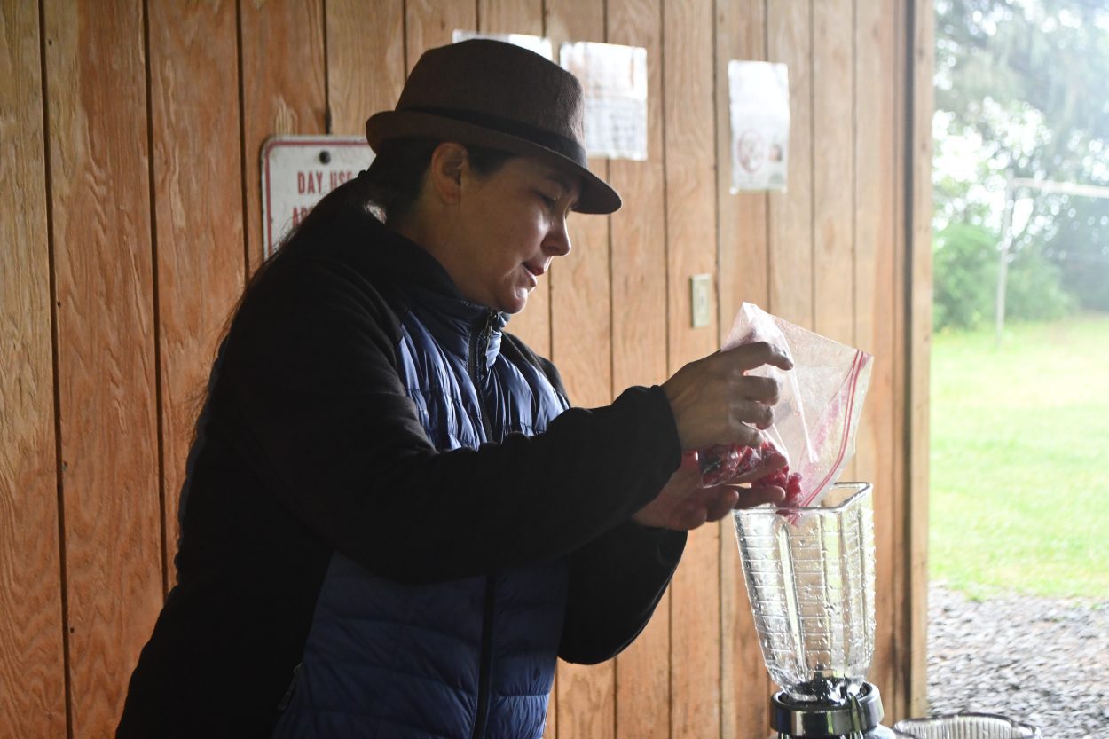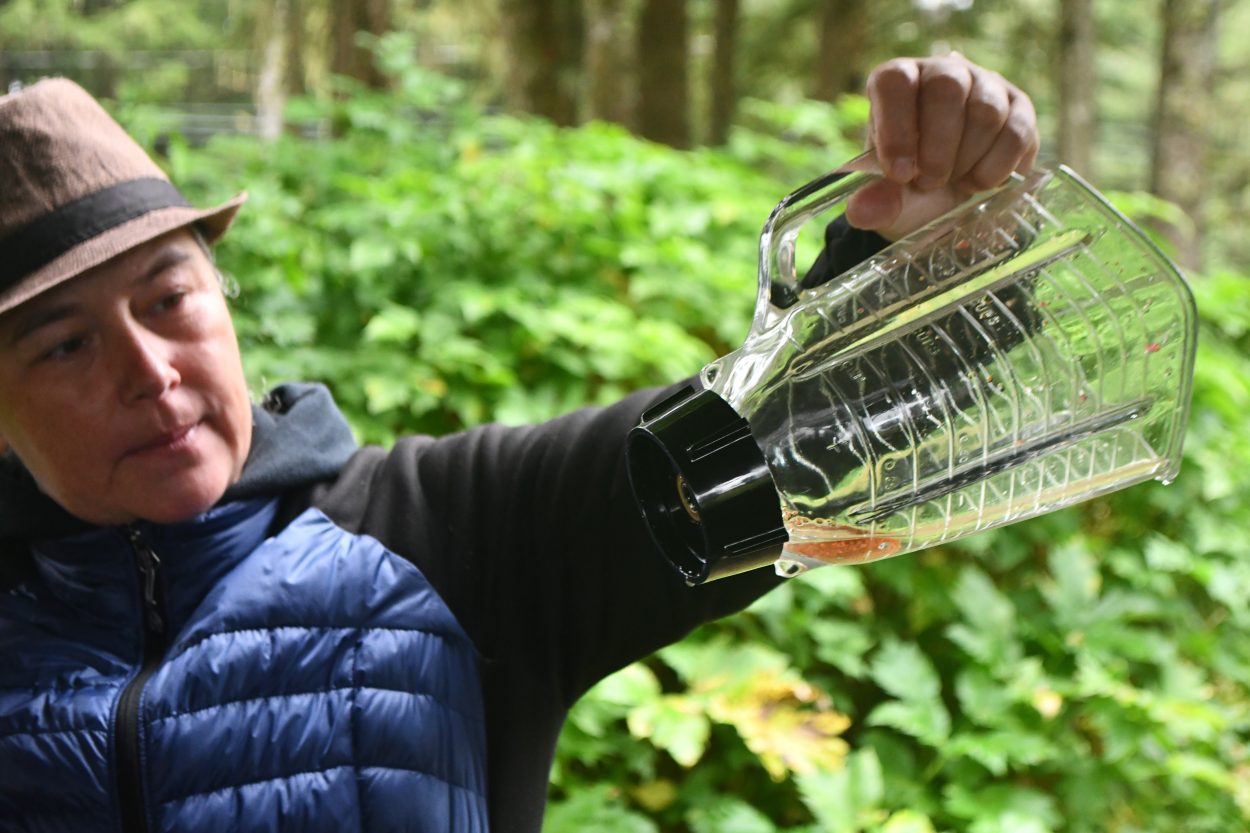 On a cold, cloudy Friday at Petersburg’s Sandy Beach Park, Vivian Yéilk’ Mork poured locally picked red huckleberries and water into a blender. Mork wasn’t making a smoothie, though, she was trying to do the opposite.