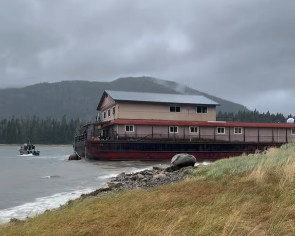 According to the Harbormaster’s Office, when the barge broke free, it drifted across the Wrangell Narrows near a green channel marker by Kupreanof Island. The winds changed, and the barge drifted back near Mitkof Island, where it grounded.