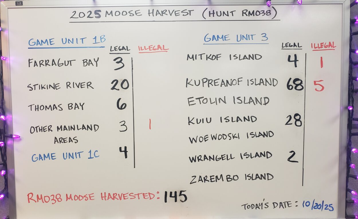 Hunters harvested one illegal and four legal bulls on Mitkof Island. Game Unit 1C, near Port Houghton, had four moose harvested. And Other Mainland Areas saw one illegal and three legal bulls harvested.