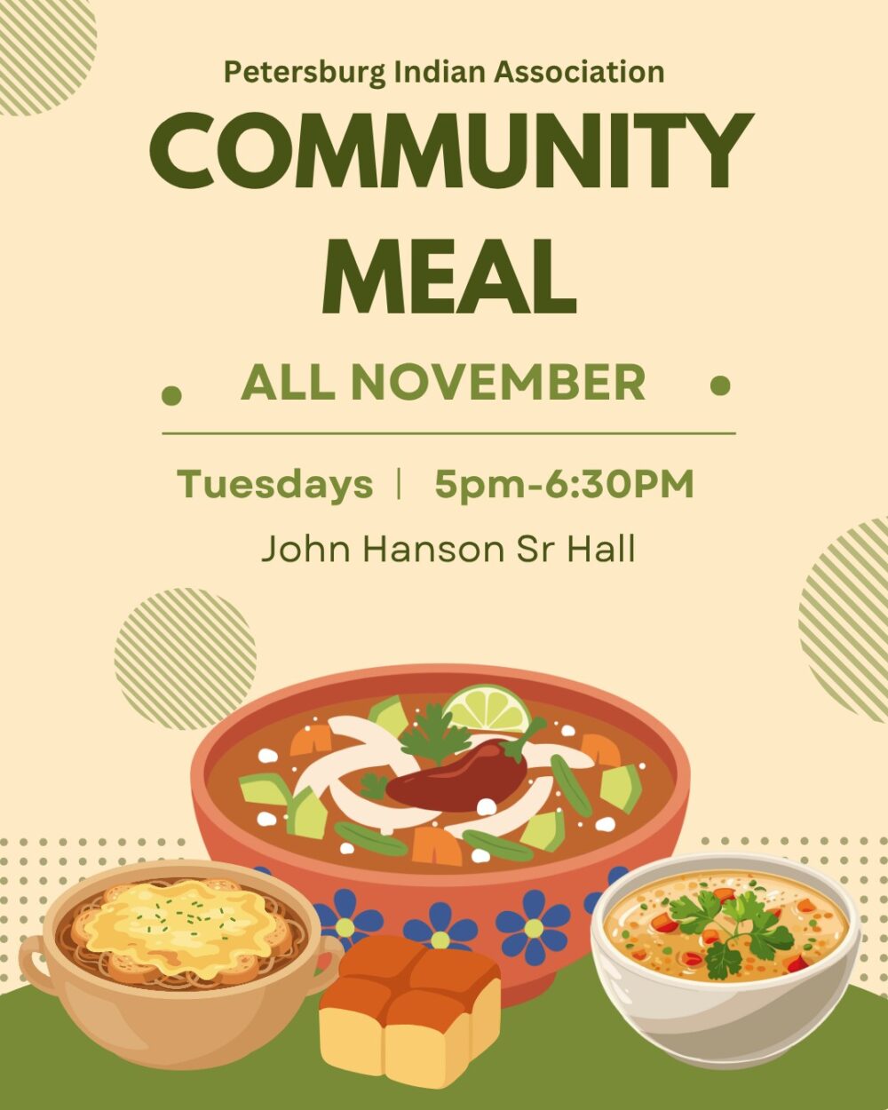 PIA is hosting community meals every Tuesday in November at the John Hanson Sr. (ANB) Hall, from 5–6:30 p.m. Contact PIA at 907-772-3636 for more information.