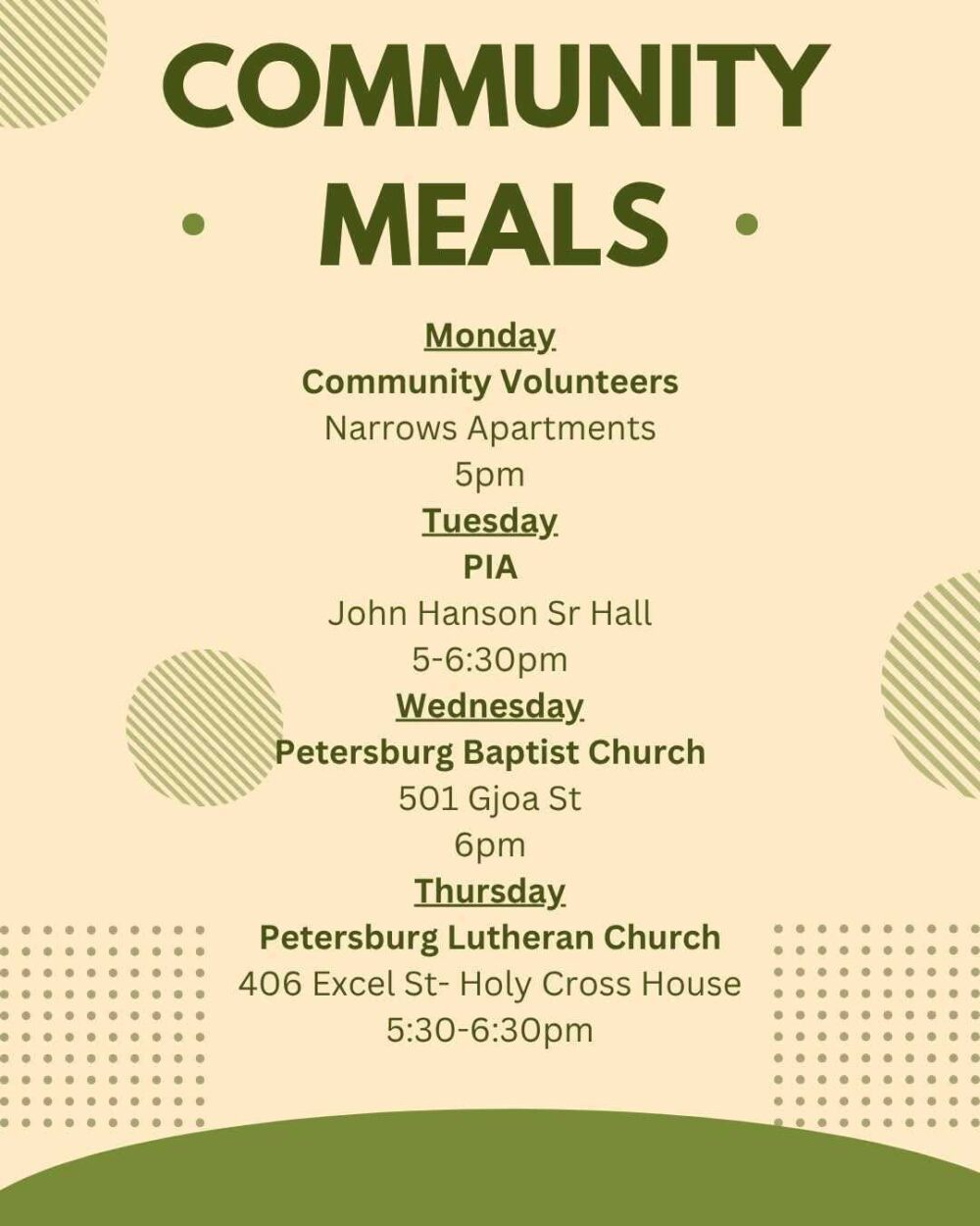 Other free community meals include Mondays at 5 p.m. at the Narrows Inn, Wednesdays at 6 p.m. at the First Baptist Church, and Thursday evenings from 5:30 to 6:30 at the Holy Cross House of the Lutheran Church.