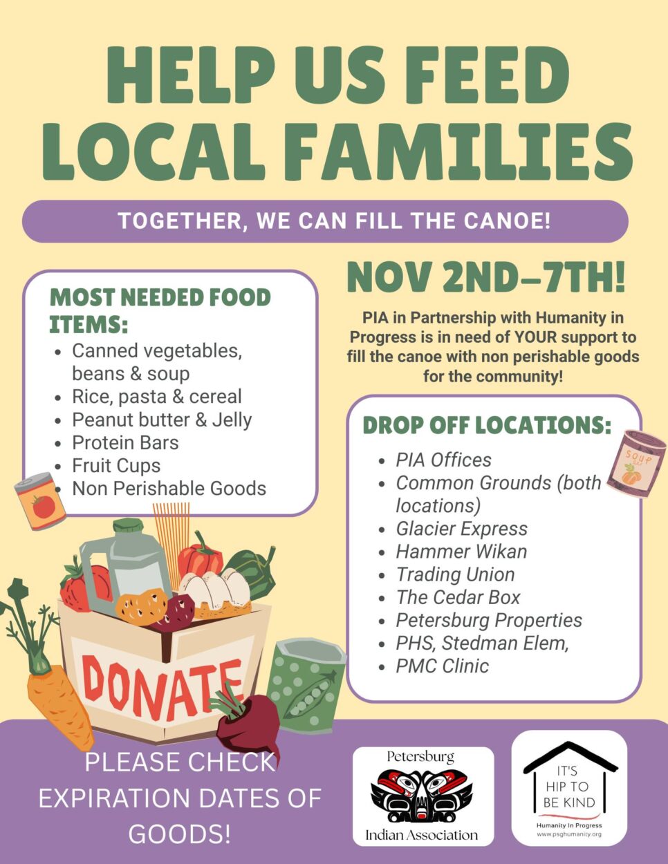 The week-long food drive through Petersburg Indian Association (PIA) ends Friday, Nov. 7. Collection totes for non-perishable goods are set up at several local stores and offices.