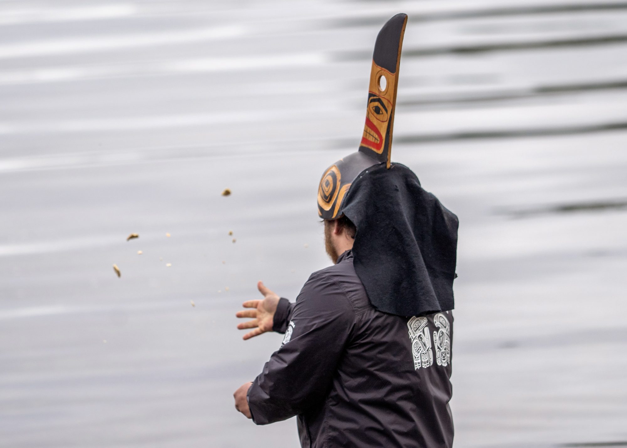 ShaaL’aanee Brandon Ware —Ware’s son and the vice president of the local tribal council— scattered pilot bread in the sea water as a symbolic gesture while Ware thanked the killer whales.