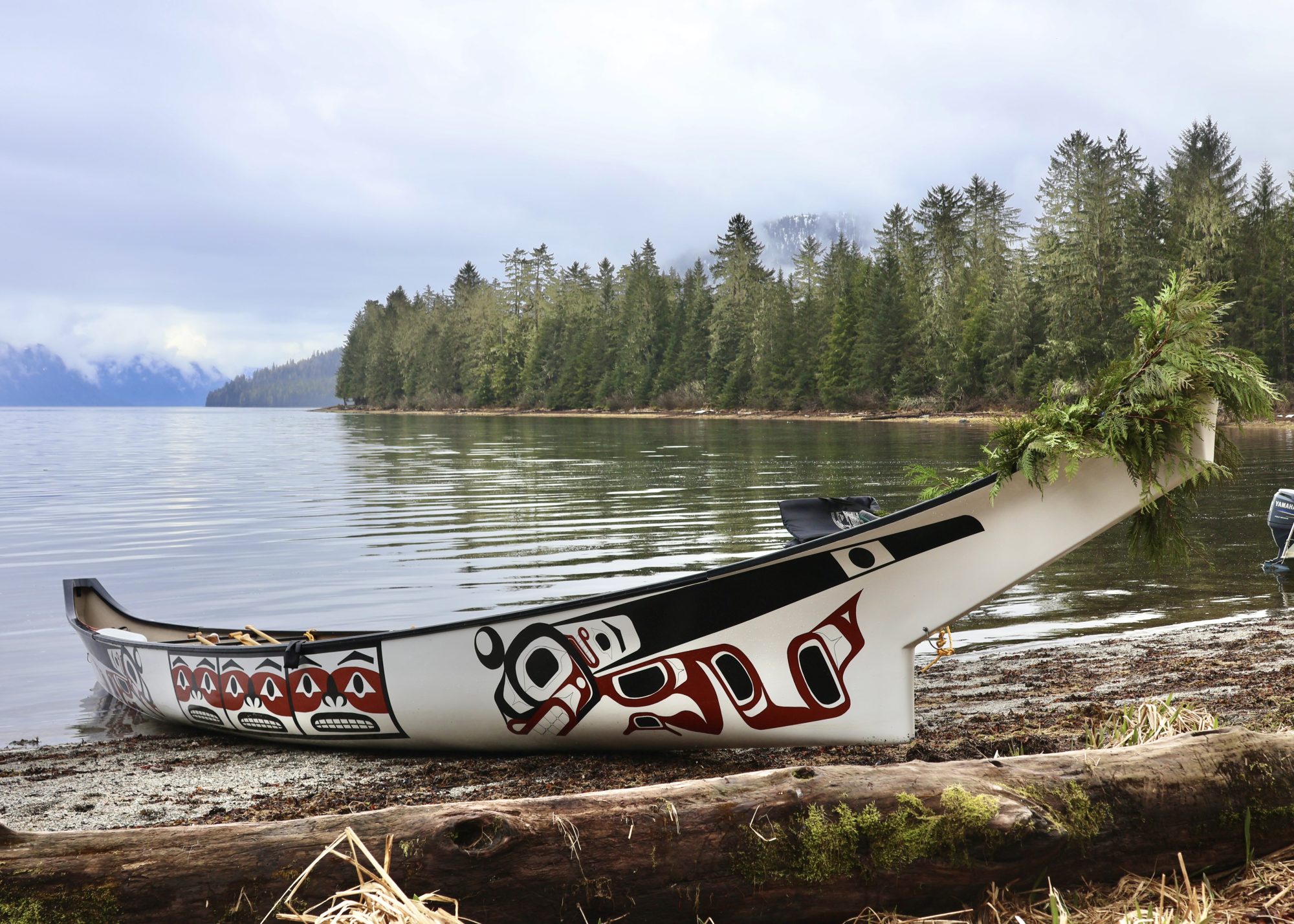 The white, Tlingit-style fiberglass canoe is nearly 40 feet long. It has red and black Chilkat faces painted in the shape of bentwood boxes down its center and a large formline killer whale design on both ends.