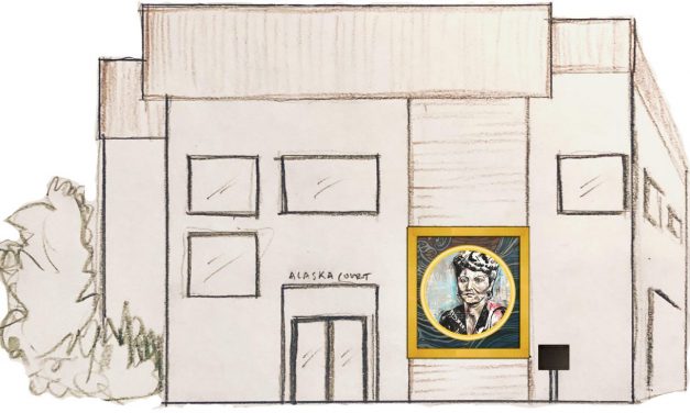 Residents marched down main street in a heavy downpour Wednesday past Petersburg’s mural of Alaska civil rights leader Elizabeth Wannamaker Peratrovich. Across Alaska people mark February 16 as the anniversary of the signing of an anti-discrimination bill passed by Alaska’s territorial legislature in 1945.
